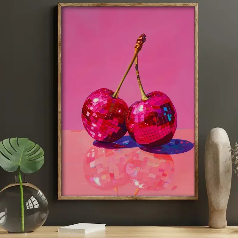 Een canvas poster kan je interieur op een stijlvolle manier verrijken. De levendige kleuren van kersen in combinatie met de glitters en het retrogevoel van een discobal zorgen voor een unieke mix van speelse elegantie. Perfect voor in de woonkamer, slaapkamer of zelfs een creatieve werkruimte. We love sparkles!