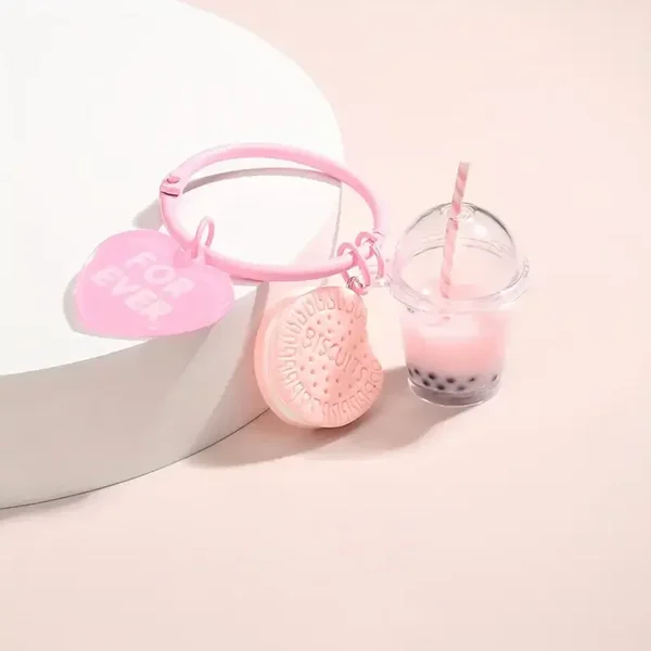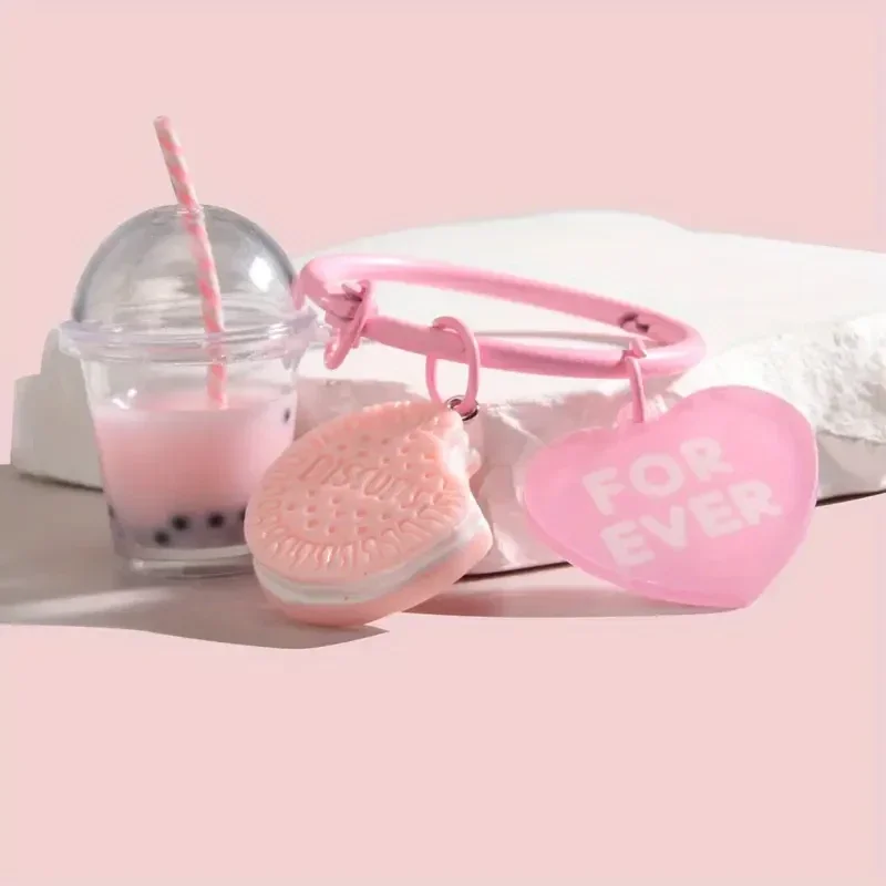 Ben je op zoek naar een unieke en leuke sleutelhanger? Deze schattige sleutelhanger in de vorm van bubble tea, een koekje en een hartje is perfect voor jou! Met zijn speelse en kleurrijke ontwerp is het een echte blikvanger. Of je hem nu aan je sleutelbos, tas of rugzak hangt, deze sleutelhanger voegt direct een vleugje vrolijkheid toe aan je dag. Het maakt ook een geweldig cadeautje voor vrienden of familie die van bubble tea en schattige accessoires houden. Kies voor stijl en originaliteit met deze charmante roze sleutelhanger!