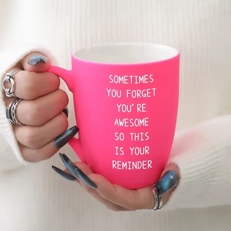 Breng wat positiviteit in je dag met deze prachtige roze beker! Op de beker staat de motiverende tekst: "Sometimes you forget you're awesome, so this is your reminder". Perfect als cadeau voor iemand die wel een steuntje in de rug kan gebruiken of gewoon om jezelf eraan te herinneren hoe geweldig je bent. De beker is zowel stijlvol als praktisch, ideaal voor je ochtendkoffie, middagthee of een warme chocolademelk op een koude dag. Laat elke slok een moment van inspiratie zijn!